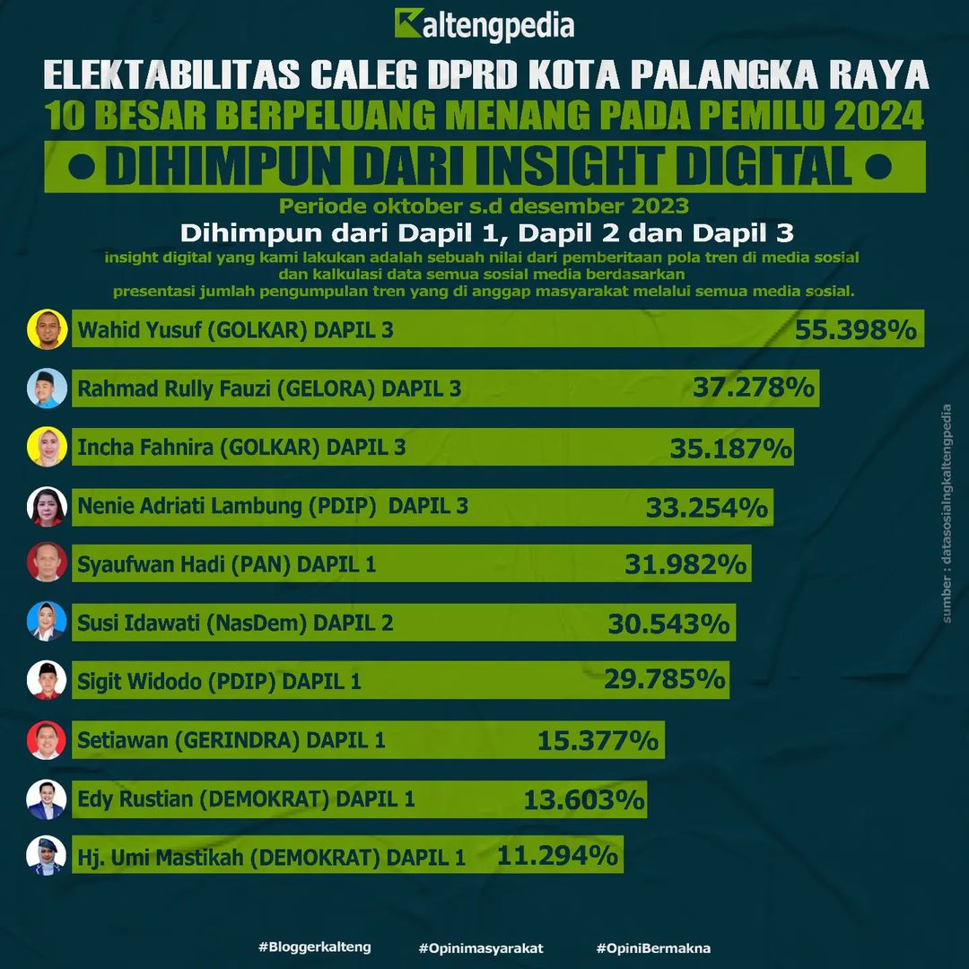 Kali ini Kaltengpedia menunjukan hasil survei elektabilitas 10 nama caleg DPRD Kota Palangka Raya dari tiga Daerah pemilihan (Dapil) yang ada di Kota setempat.