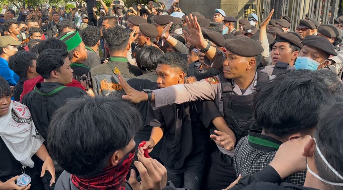 Unjuk rasa yang awalnya berlangsung damai berujung ricuh setelah massa mencoba menjebol pagar besi. Polisi menembakkan water cannon, sementara massa membalas dengan lemparan botol dan dorongan ke pagar.