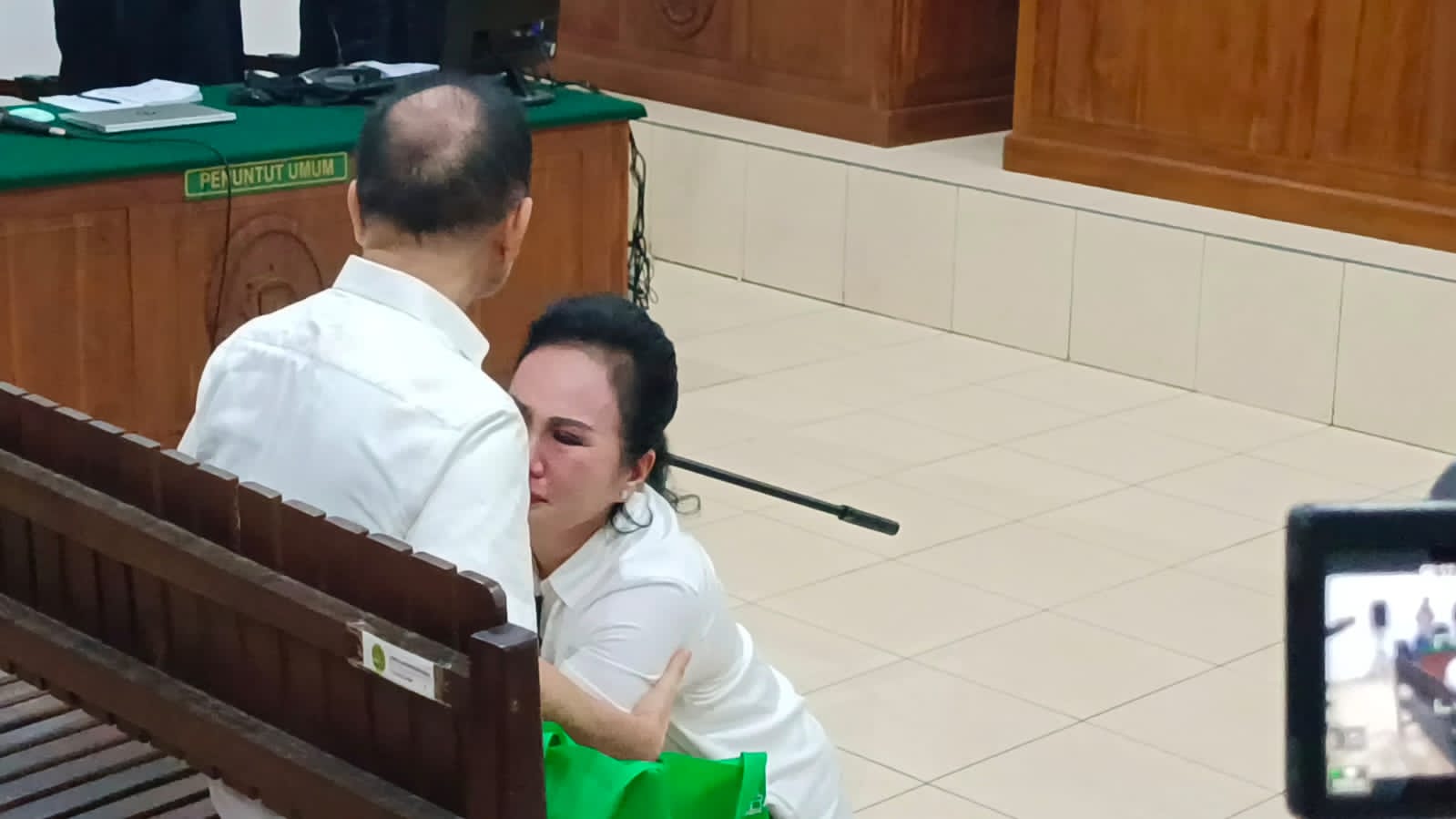 Usai mendengarkan putusan majelis hakim, Ary Eghani tampak menangis bersujud di kaki sang suami, Ben Brahim.