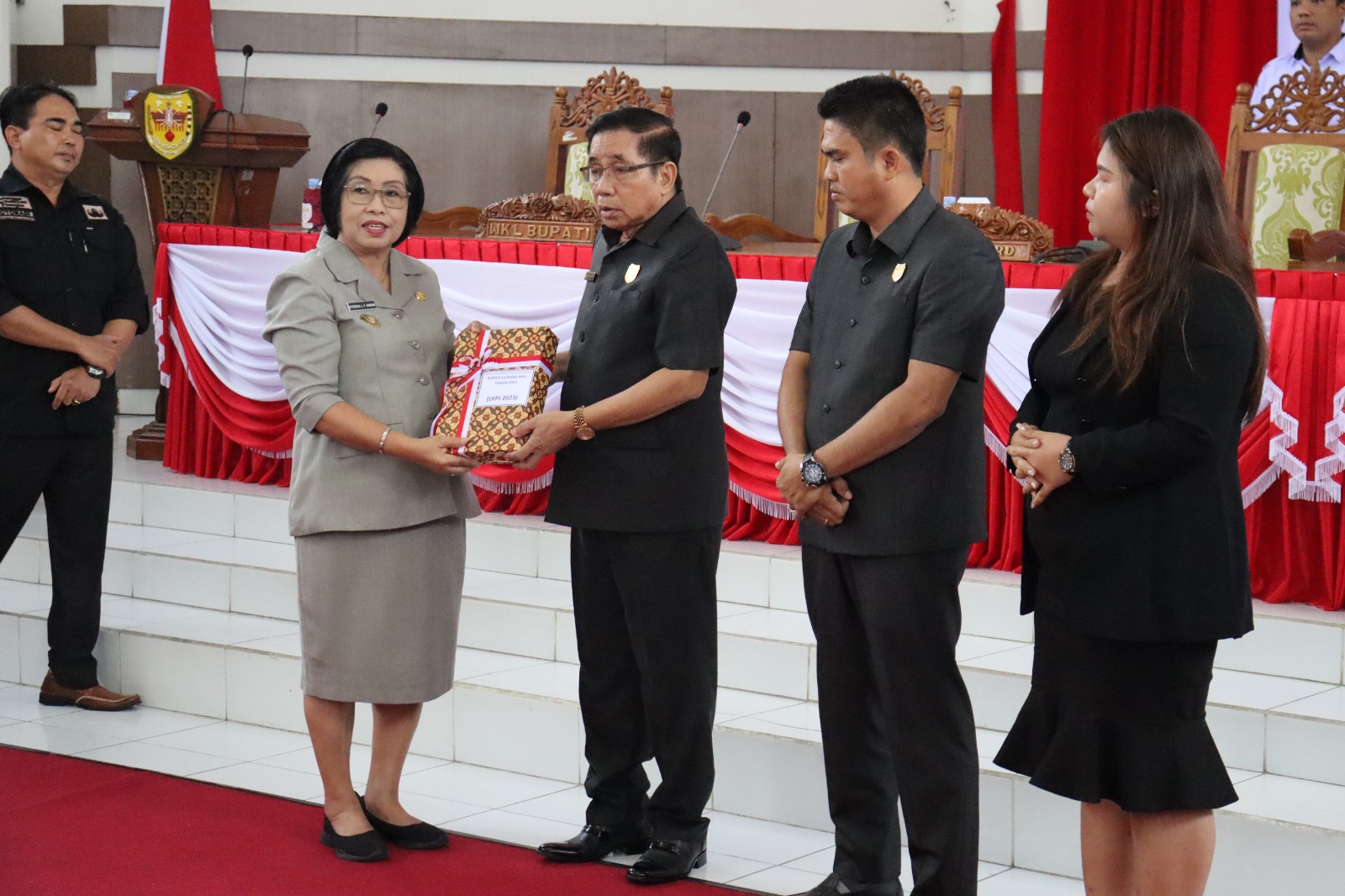 Ketua DPRD Kabupaten Gunung Mas Akerman Sahidar saat menerima laporan Pertanggungjawaban pemerintah Kabupaten Gunung Mas tahun anggaran 2023 yang di serahkan oleh Wakil Bupati Efrensia L.P Umbing.