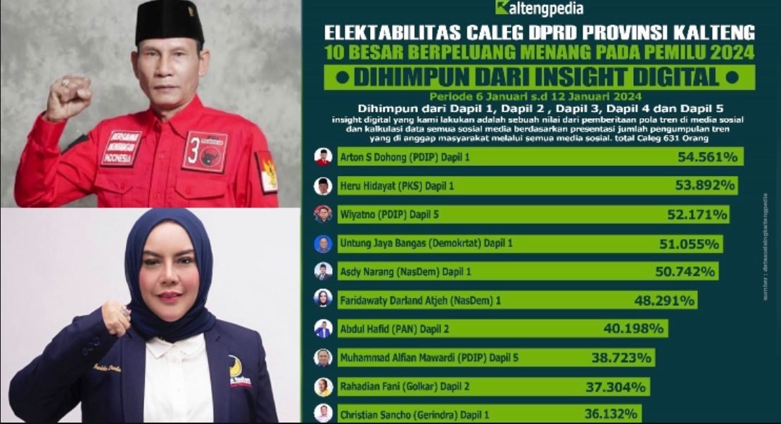 Dalam survei yang dirilis Kaltengpedia, terdapat 10 Caleg yang mana 2 Caleg diantaranya merupakan pimpinan partai daerah dengan elektabilitas tertinggi yang berpeluang menduduki kursi DPRD Kalteng di Pemilu 14 Februari 2024 mendatang.