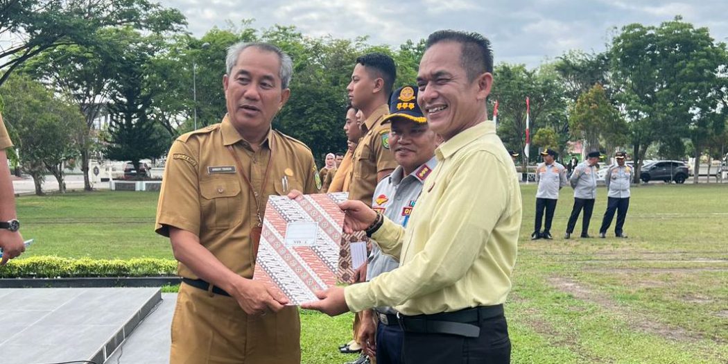 Surat perintah pelaksana tugas diserahkan oleh Plh Sekretaris Daerah (Sekda) Kota Palangka Raya, Arbert Tombak kepada Berlianto saat apel pagi di halaman kantor Wali Kota Palangka Raya, Senin (2/9/2024).